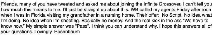 罗森巴姆发推,写得很明确:上周五他正在佛罗里达一家养老院看望祖母,华纳给他的经纪人打电话问他要不要出演试播集,“他们给的offer是:无剧本,‘你要演的戏份是什么’无说法,‘何时开拍’无说法,基本上不给钱。最让我失望的一击是:他们表示“现在就要知道答复’。”所以他拒绝了,表示认为大家能够理解他的做法,并感谢了很多网友询问他是否会回归交叉集的热情和支持。