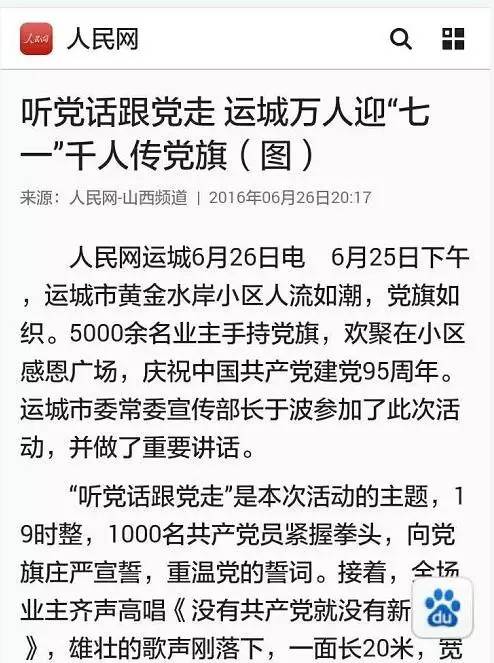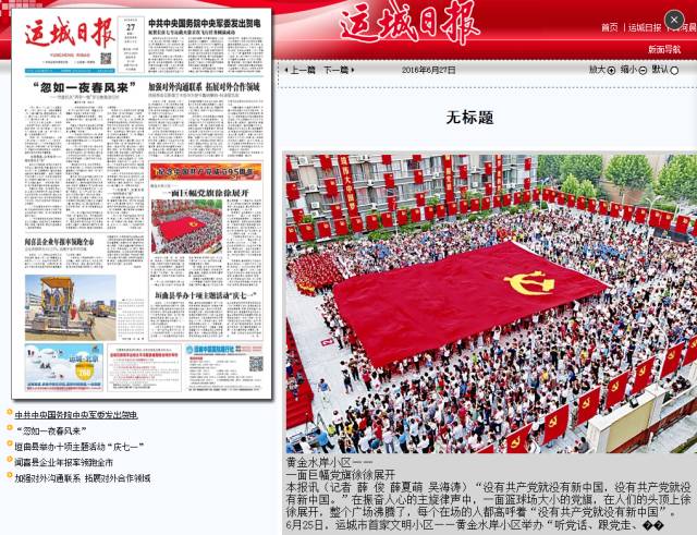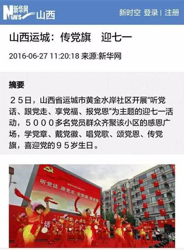 昨天早上6:05,中央一套、十三套新闻《朝闻天下》、中午12点10分中央4台中文国际频道分别重磅报道山西运城黄金水岸小区《学党章 唱党歌 传党旗 迎七一》大型庆党建活动,将古中国新运城的影响力推向了全国。