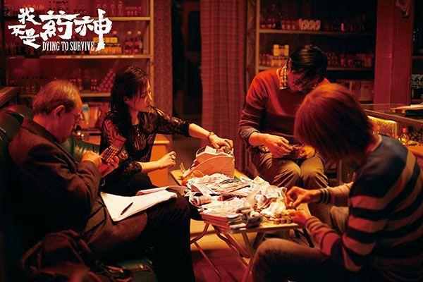 电影中,程勇(中)带着几名患者创建了公司,贩卖仿制药。