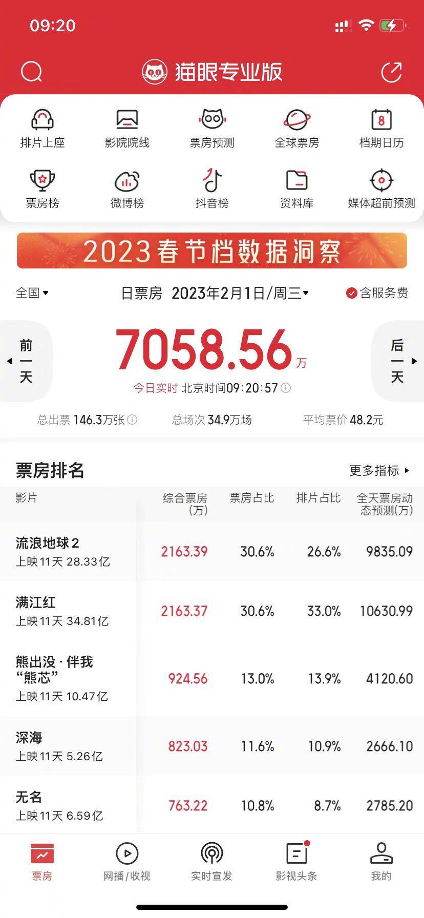 据悉,自从春节档影片上映以来,除去大年初一的单日总票房第一名是《流浪地球2》之外,此后单日总票房的第一名则一直是《满江红》。