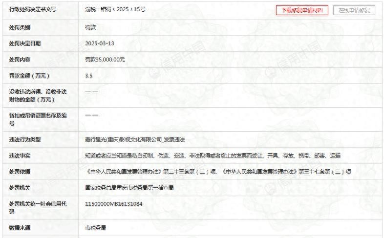 齐鲁晚报·齐鲁壹点记者于信用中国官方网站了解到,近日,嘉行传媒旗下的嘉行星光(重庆)影视文化有限公司因发票违法被罚。