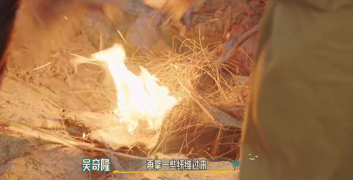 用两颗打火石解决了岛上唯一的打火机坏掉、侯雯元钻木取火一下午未果的烦恼。