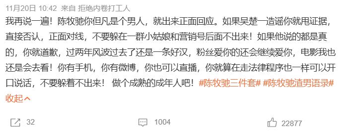她们说如果吴楚一说的是假的,就正面出来对刚,如果吴楚一说的是真的,那就老老实实道歉,过两年风波过去了还是一条好汉。