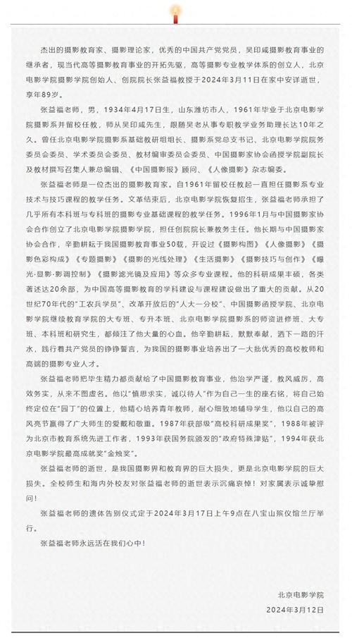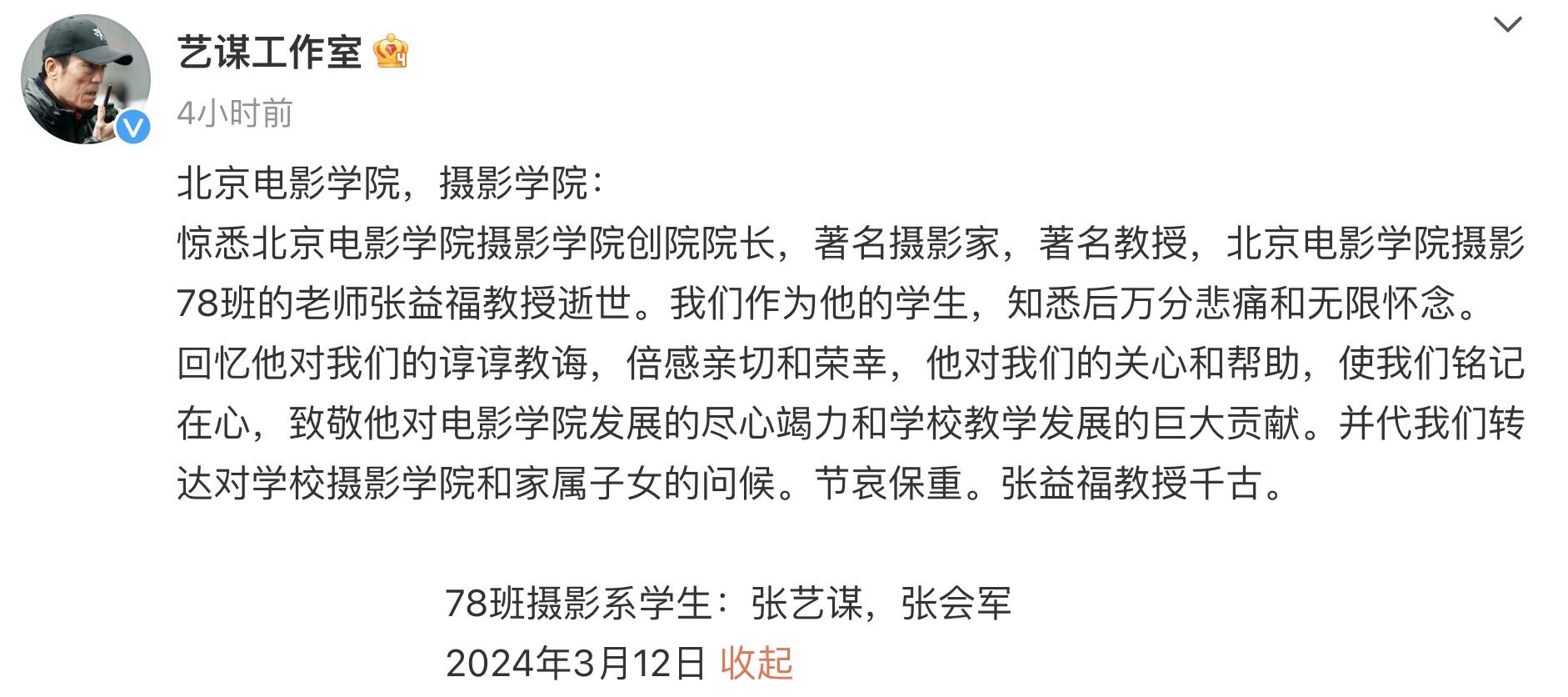 > 头条导读:中国电影界迎来了一个令人沉痛的消息,著名导演张艺谋向他的恩师、摄影大师张益福致以深情的告别。在这一份感