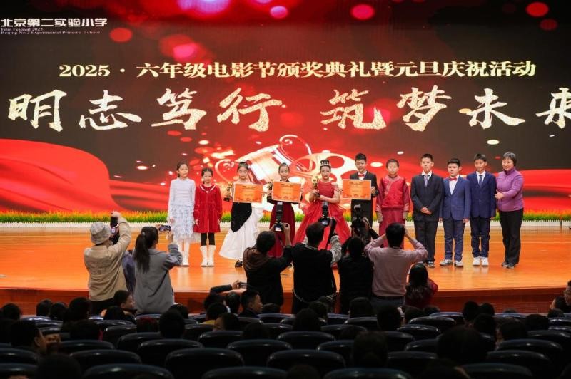 新华网北京12月31日电(记者高菲菲、马晓冬)2024年12月31日,北京第二实验小学开展“明志笃行 筑梦未来”六年级电影节颁奖典礼暨元旦庆祝活动。全年级14个班级共提交70余部“微电影”,题材丰富,视角独特,展现出小学生们对国之爱、对家之爱、对学校之爱……通过“微电影”的制作,培育学生良好品德。