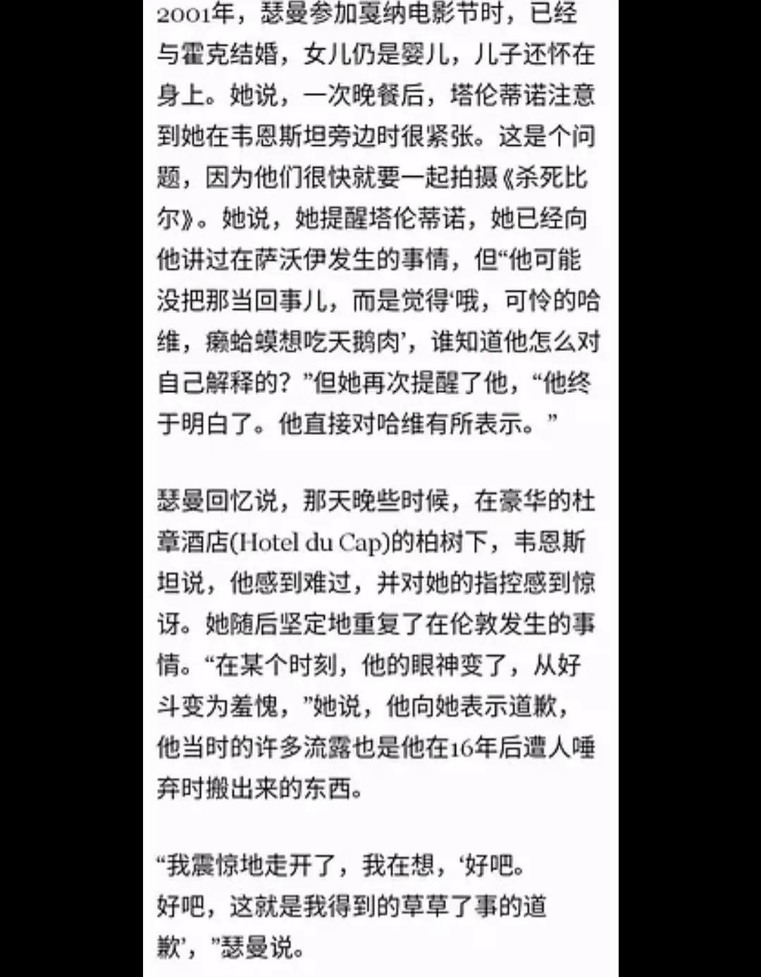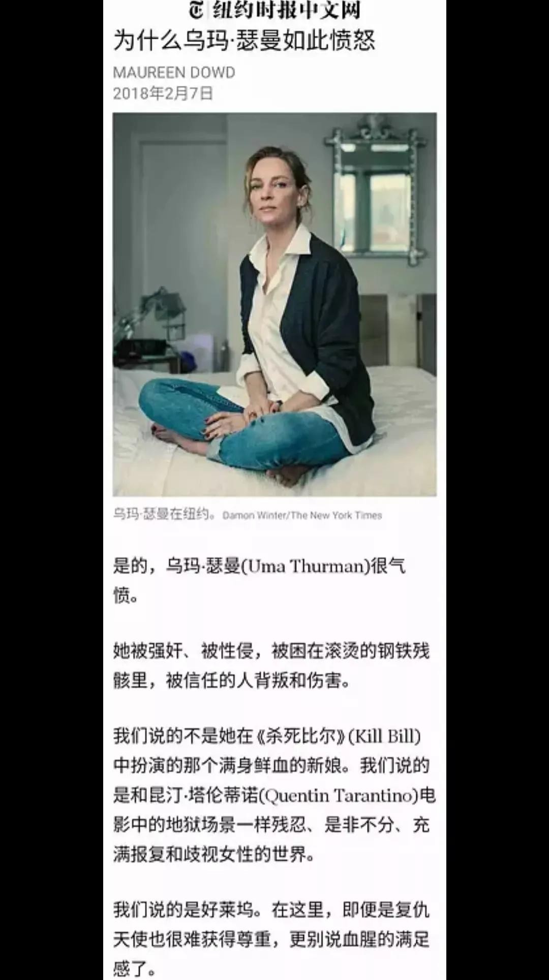 乌玛瑟曼一直是我非常喜欢的一位好莱坞演员。从《低俗小说》,《千钧一发》再到《杀死比尔》。她给我的印象无论是戏里戏外都是一位坚强独立,甚至是有点彪悍的女性形象。但是在2018年,她在接受纽约时报采访时的一席话,让我又对她的从影之路有了另外一种观察的角度。在采访过程中,乌玛瑟曼对当年韦恩斯坦的性骚扰直言不讳,并且表示,对他的行为深恶痛绝,并且谈到自己刚入行时,在16岁时的一段遭遇。