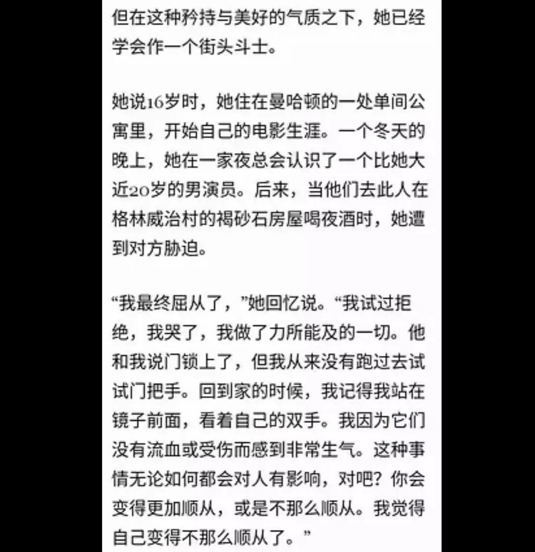 她说16岁时她住在曼哈顿的一处单间公寓里,刚开始自己的电影生涯,一个冬天的晚上,她在一家夜总会认识了一个比她大近20岁的男演员,后来当他们去此人在格林威治村的房子喝夜酒时,她遭到对方胁迫。并且最终屈从了!