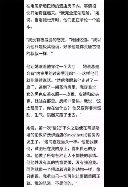 而在成名以后,非但没有减少这类事情反而变本加厉。像韦恩斯坦这种资本大鳄更是对女演员觊觎已久,处心积虑地想要得到每一名女演员。威逼利诱的方式。触目惊心。