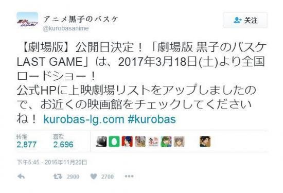 《黑子的篮球:LAST GAME》将在明年3月于日本先行上映