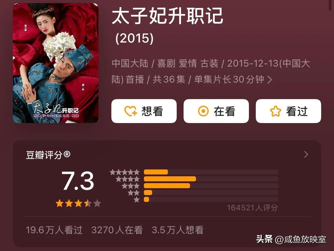 剧情评价:《太子妃升职记》是一部极具开创性的网剧。它打破传统,以新奇的“男穿女”设定,在众多古装剧中脱颖而出,诙谐幽默的剧情,笑料十足,让观众看得欢乐又解压。主演张天爱、盛一伦凭借此剧崭露头角,将角色演绎得生动鲜活,很好地诠释出角色间的情感变化。由于受限于制作成本,服化道略显简陋,特效也不够精致,但独特的剧情设定和演员们的精彩表现,让观众忽略了这些不足。它以小博大,成为现象级网剧,为网剧发展提供新思路,在国产剧中留下独特印记 。