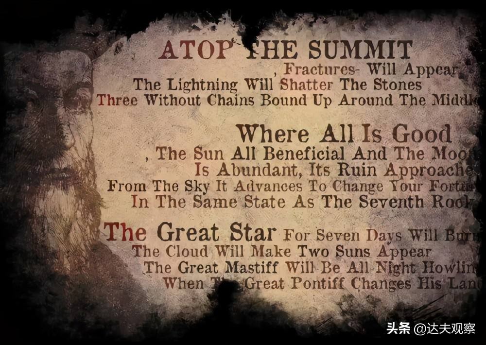 法国籍犹太裔预言家米歇尔·德·诺特达姆(又名诺查丹玛斯)在 450 多年前出版的预言集——《百诗集》(Les Propheties,又名《诸世纪》)中对未来进行了许多预测。诺查丹玛斯的预言,无论他在生前还是死后,都吸引了来自世界各地的许多崇拜者。《诸世纪》出版后,见证了数量惊人的预言成真,直到现在依然非常畅销。许多研究者,将他的预言与世界主要事件分析,并找到应验的地方。预言家诺查丹玛斯所著《诸世纪》中记录的预言诗,为何如此准确?《诸世纪》是史上最著名的预言书?其中蕴含击碎人类理性的咒语?