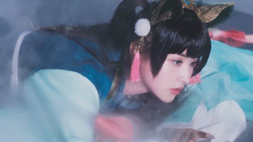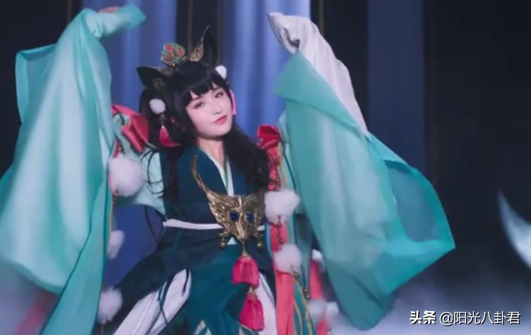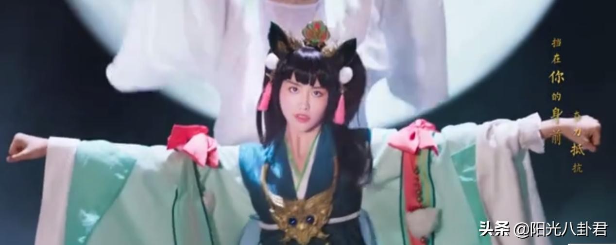“喵千岁”整体造型和金子涵“猫系少女”的气质一拍即合,一双毛茸茸的猫耳朵为本身美艳的金子涵增添了几分慵懒,猫耳朵两边挂着的粉色流苏更添几分灵动,很符合“猫”的属性。蓝绿色的轻纱裙衬得原本雪白的金子涵更像仙女一般。