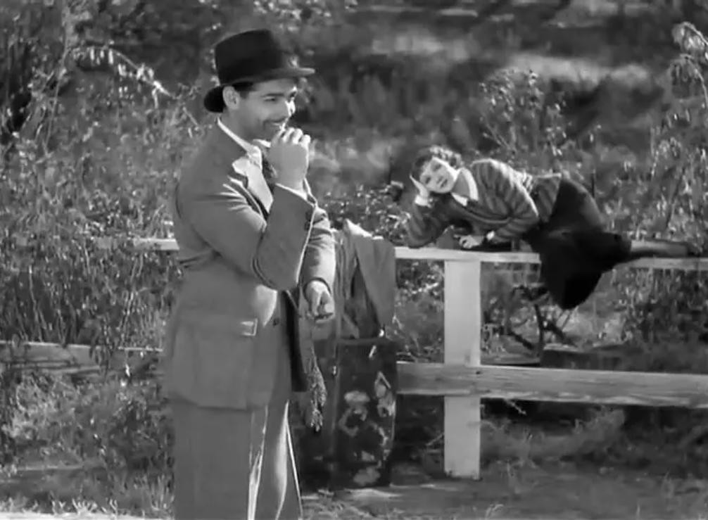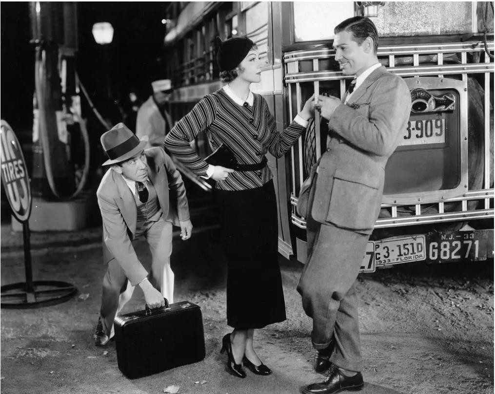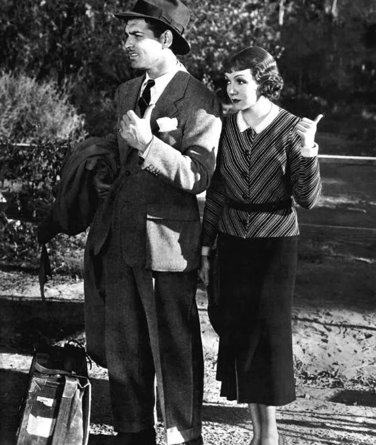 这是一个公路电影,讲的是,盖博饰演的记者彼得遇到逃婚的富家女爱丽,一同前往纽约的路上发生的事。