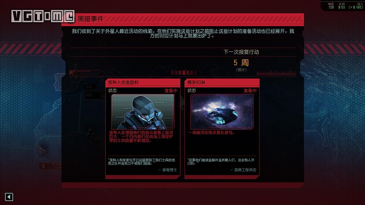 黑暗事件会在初期就开始发生,敌人会在固定回合内完成这些研究,而玩家需要在之后的报复行动中进行选择,比如可选三个报复行动A、B、C,A行动可以反击变种人合金垫料,B行动可以反击外星人毒头子弹,那么完成A,外星人就无法研究出合金垫料,但是不管怎么选,都会有其他黑暗事件完成。