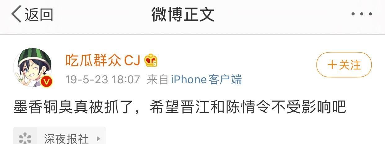 《陈情令》播出前夕,微博账号“吃瓜群众CJ”发博称墨香铜臭被抓。而后作者在晋江更新状态辟谣