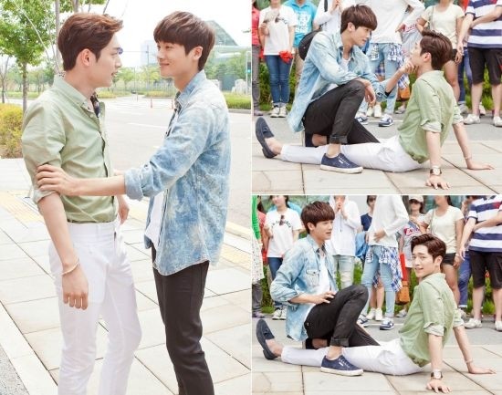 接下来写的男男CP是韩国正当红的朴炯植(从《继承者们》中走出的贵公子)与徐康俊。这两人的同框几率如同内地的胡歌和王凯。只要两人在一起合影,那就是满屏的粉红。从购剧方提供的幕后照片来看,两人的暧昧动作着实让大家浮想联翩。照片中,两人在人来人往的马路上,徐康俊似乎精疲力尽而瘫坐在地上,朴炯植则用手抓住徐康俊的下巴让他直视自己的眼睛,两人全然不顾围观的群众表现出如此充满暧昧的动作,让人们不禁充满了好奇。在剧中,两人为爱打得不可开交,但现实中年纪相仿的两人却是亲密无间的伙伴,只要一有空闲时间就发挥搞笑才能,营造出愉快的拍摄氛围。所以,每当两人又表现出容易让人产生猜测的动作时,剧组工作人员就齐声为他们配上表达恋人之间朦胧爱情的背景音乐,总会引得大家捧腹大笑。