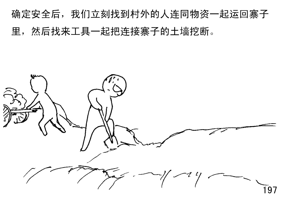 确定安全后,我们立刻找到村外的人,连同物资一起运回寨子里,然后找来工具,一起把连接寨子的土墙挖断。劳累了一天,吃了点东西后,大家钻进睡袋,昏昏睡了过去。
