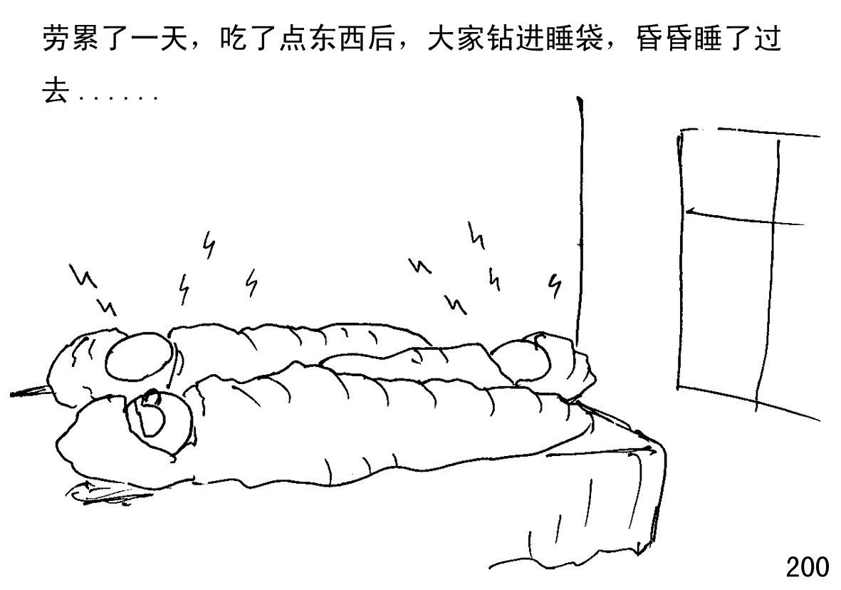 劳累了一天,吃了点东西后,大家钻进睡袋,昏昏睡了过去。