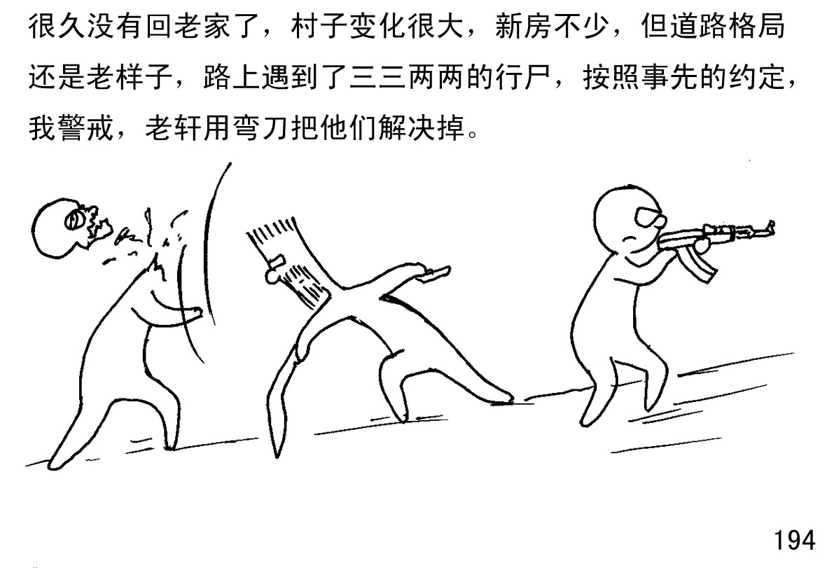 很久没有回老家了,村子变化很大,新房不少,但道路格局还是老样子,路上遇到了三三两两的行尸,按照事先的约定,我警戒,老轩用弯刀把他们解决掉。