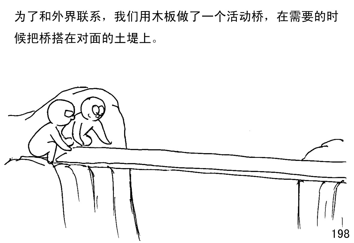 为了和外界联系,我们用木板做了一个活动桥,在需要的时候把桥搭在对面的土堤上。