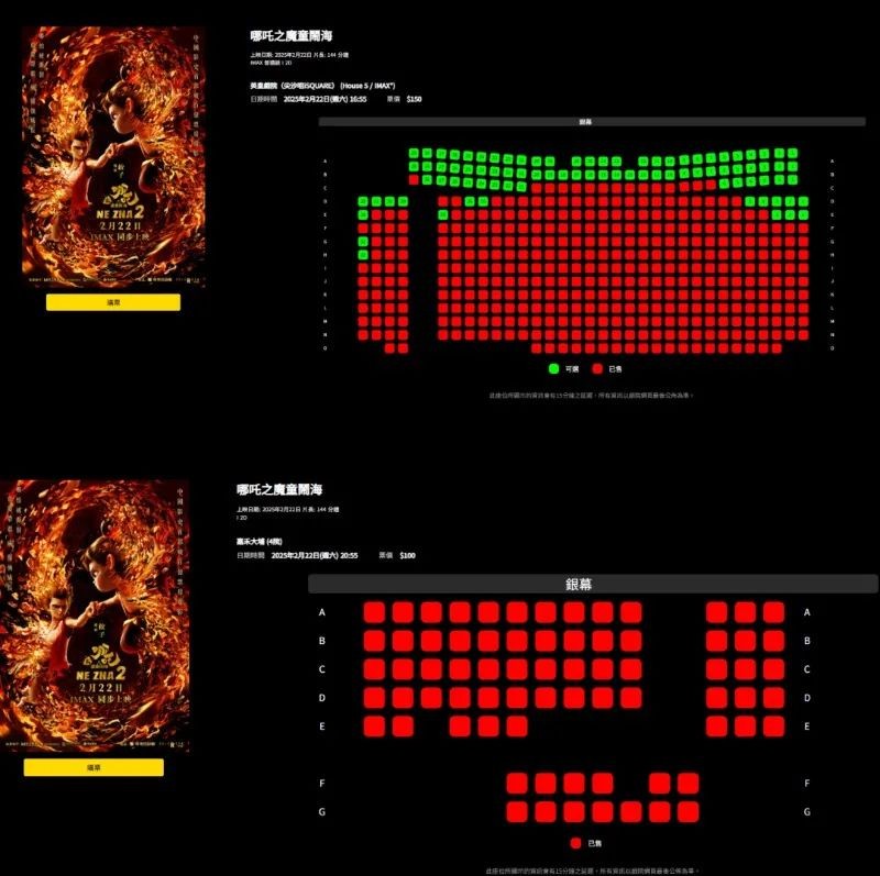 《哪吒2》部分场次购票情况。图源 | HK movie官网