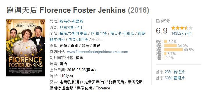 影片改编自20世纪“女高音歌唱家” Florence Foster Jenkins的真实经历,讲述了五音不全的歌剧爱好者Jenkins,从私人俱乐部一路唱到卡内基音乐厅的心路历程。梅姨演绎女高音Jenkins,七十多岁高龄,中气十足,却五音不全,对自己的认知都来自外界的莫名保护,从来不清楚自己身上的缺陷,以对歌剧的狂热完成了一生的追逐。