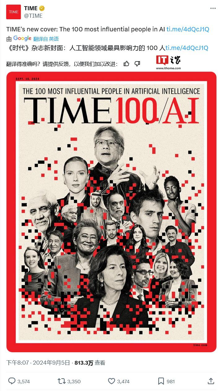 IT 之家 9 月 7 日消息,《时代》(Time)杂志最新公布了 2024 年 AI 领域百大影响力人物榜单,台积电董事长魏哲家、英伟达首席执行官黄仁勋、AMD 董事长兼首席执行官苏姿丰等上榜。