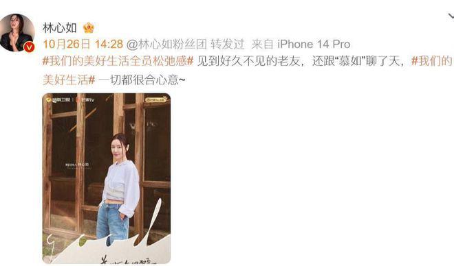 26 日,林心如宣传综艺《我们的美好生活》,称见到好久不见的老友,还跟 " 慕如 " 聊了天。
