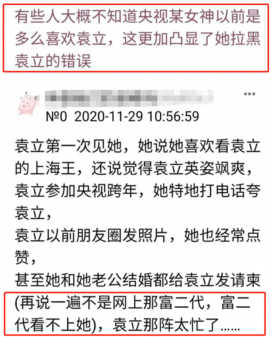 此前疑似袁立的小号就曾爆料过某央视女神主持拉黑了她,这次又提到这位女主持,称她结婚的时候发了请柬给袁立,并且强调女主持的老公不是网传富二代,因为富二代看不上她。