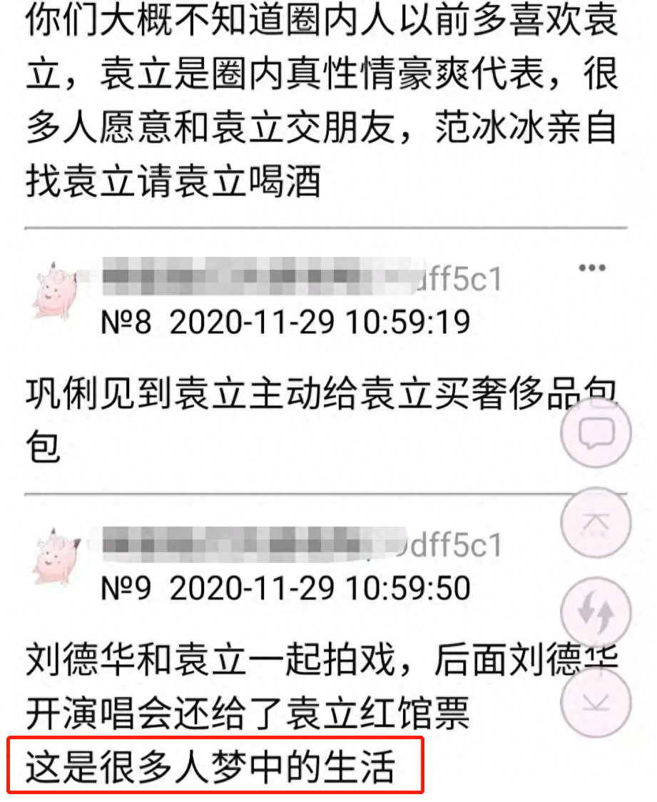 爆料中还称圈内人很多想和袁立交朋友,范冰冰还请她喝酒,巩俐见到袁立还主动给她买奢侈品包包,刘德华还送她演唱会的门票,刘嘉玲在上海开派对还特地打电话请她来,最后还来了句“这是很多人梦中的生活”,满满的优越感。