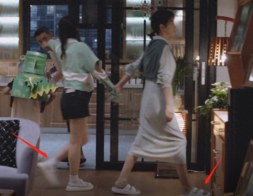 先来看远景的,因为是家庭内部戏,所以,赵今麦和闫妮都穿着同款平底拖鞋,这也就意味着二人的起点是一样的,而二人头顶的高度也相差不大,都能很好的满足169cm和165cm这两个身高。