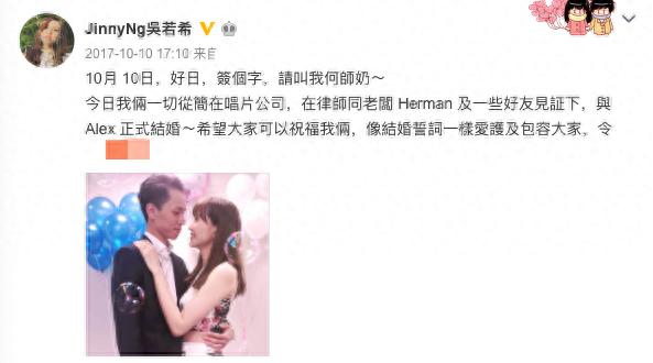 直到17年10月10日的时候,吴若希罕见在网上晒出了自己和何兆鸿的合照,宣布两人正式领证结为夫妻。