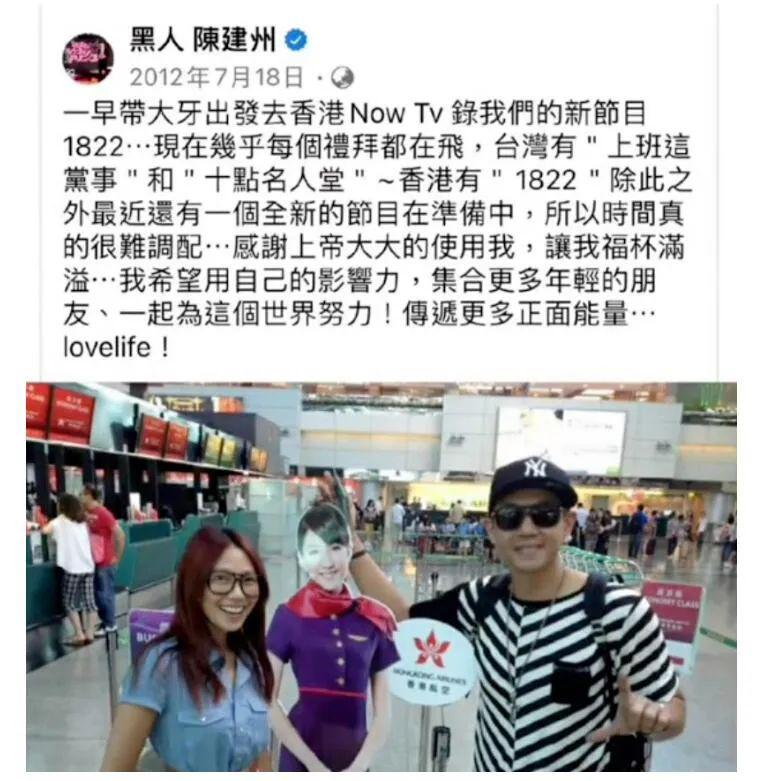 如果是真的,一个连 " 借卸妆油 " 都谋划得明明白白的人,没有证据砸他头上,确实很难逼他认罪。而在经过那样一个,大牙声称是 "11 年都无法走出恐惧 " 的夜晚,隔天,陈建州仍然如常地和大牙工作。好死不死,2012 年 7 月 18 日,陈建州 po 过带大牙的香港出差。就是说,不知道当晚有没有发生性骚扰,但至少出差是真的。