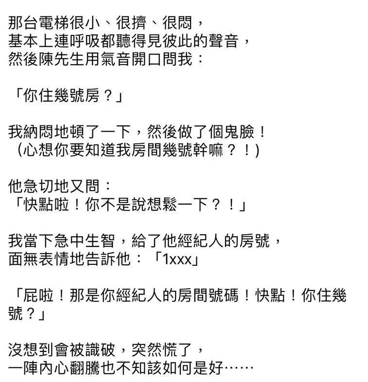 但因为陈建州的风格就是讲话大喇喇,这时的大牙并没有特别在意。直到到了酒店,在电梯里,大牙察觉不太对劲。陈建州追问她房间号,乱报一个经纪人的房号还被他当场戳穿。