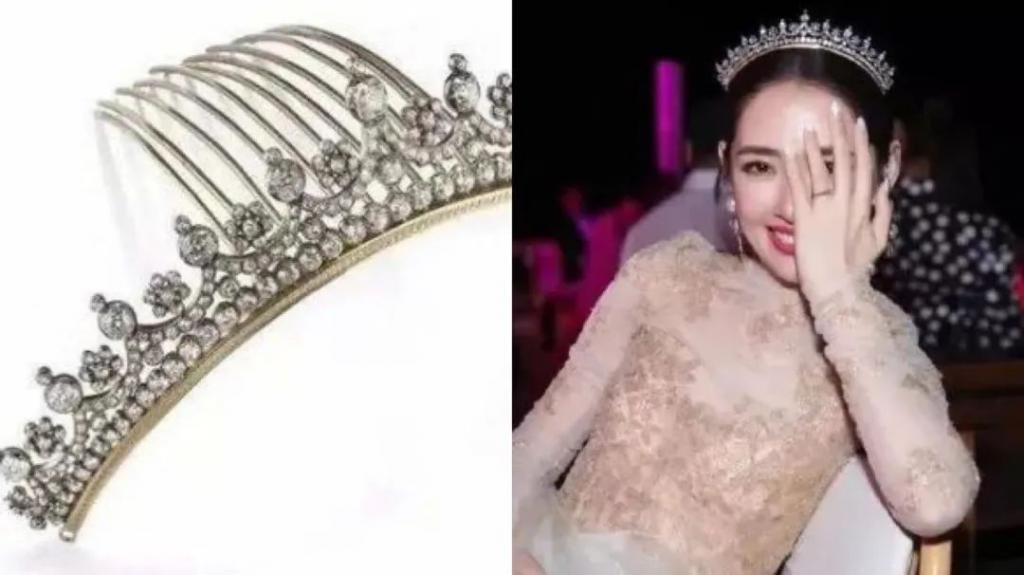 配合婚纱的王冠,是婆婆向太的私人收藏,来自于 1900 年左右的欧洲皇室,向太在 2011 年的米兰拍卖会拍得,合计 200 多万 RMB。