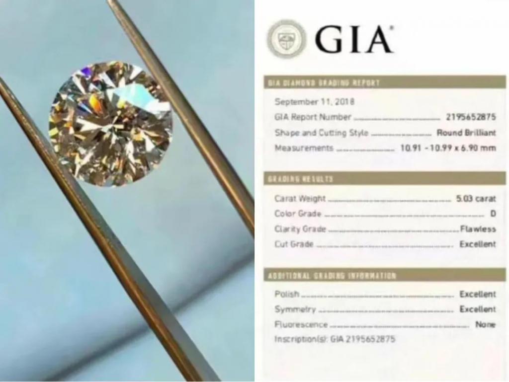 这枚戒指是 5.03 克拉的最高等级 D,净度是 FL。