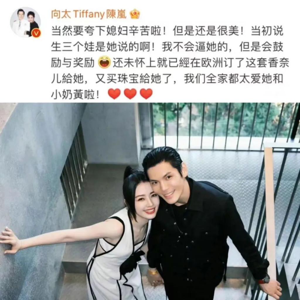 一胎刚生完,就在微博公开 " 奖励 " 儿媳妇,给她订香奈儿礼服还有大珠宝。并时刻不忘 cue 一下 " 生三个 "。