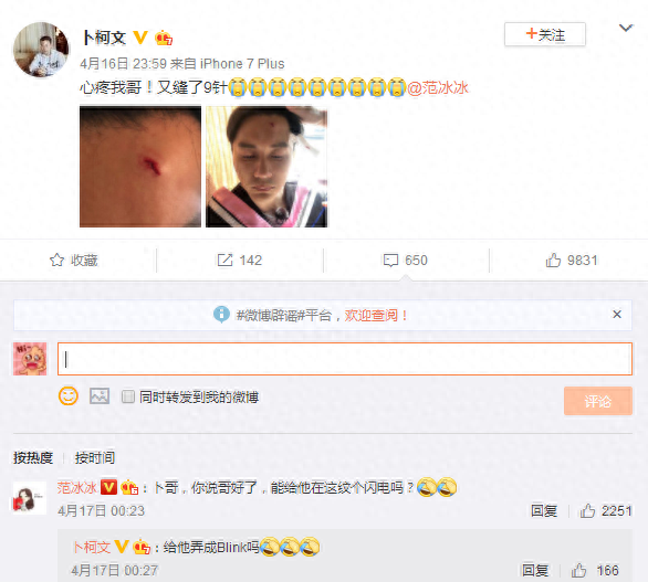 后来,李晨的好友卜柯文在微博上发了李晨的受伤照片,表示心疼,李晨伤口被缝了9针,还特意艾特了范冰冰。