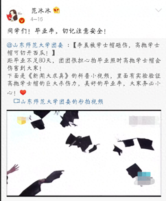 范冰冰也是非常暖心的提醒各位当季毕业生,抛学士帽的时候一定要注意安全,这个举动也是非常赞了。