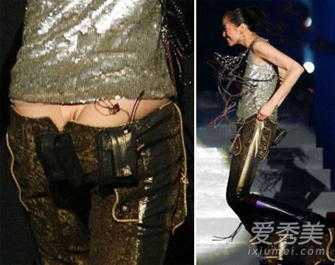 梁咏琪在上海举办演唱会,全程清凉解放大玩性感,无奈腰上无线麦克风设备太重,跑动中低腰裤开裂下滑,不慎走光;估计这被称做香港最纯情的玉女一生中最难忘的尴尬记忆。