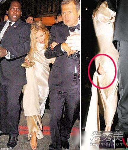 世界名模凯特·莫斯穿着名贵的套装参加一次晚会,几个小时后结束时,华丽的服装已经变得破碎不堪,衣服崩裂让其春光乍泄,狼狈不堪。