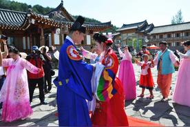 朝鲜族礼仪是朝鲜族文化的重要组成部分。在朝鲜族的婚礼中,新郎要在新娘到来之前先行回家宣布新娘到来的消息,向东向西拜祭祖宗,以此表示对先人的尊敬。
