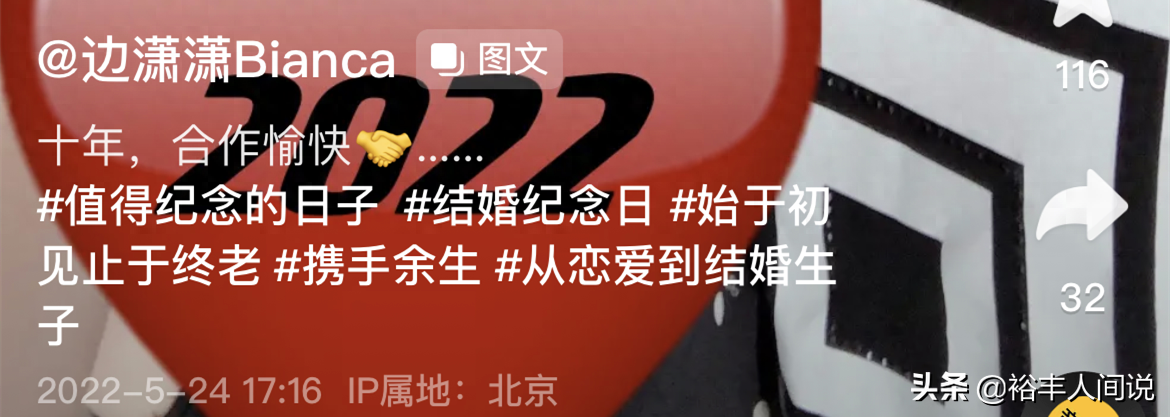 5月24号,曾在《正阳门下》扮演“苏萌”的边潇潇晒夫妻合照庆祝结婚10周年,并在留言处说道:十年,合作愉快。另外,她还添加了“值得纪念的日子、结婚纪念日”等标签。
