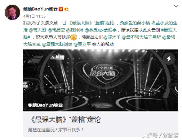 鲍橒这条长微博的标题是——《最强大脑》“盖棺”定论,文章里说了很多,包括了对这一季《最强大脑》整个的看法、对选手和赛制的看法、以及对外界所质疑的比赛作弊和黑幕的看法......