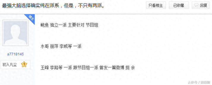 很多人说《最强大脑》到了这一季,存在很多帮派,他们经常是抱团取暖,然后一起去排挤其他人。这其中鲍橒是独立一派,偶尔会发微博针对节目组,而王峰和李璐自然是一派,他们和节目组是站在同一条战线上,王峰就曾发微博力挺过余奕沛。剩下的一派便是水哥、贾立平、李威等人。在节目中大家好像也没什么不愉快的,但在节目之外,他们就开始了各种“暗斗”,一刻也没有消停过。于是当这一季的《最强大脑》即将到了收官的时候,场外的种种争议却远还没有结束。