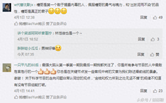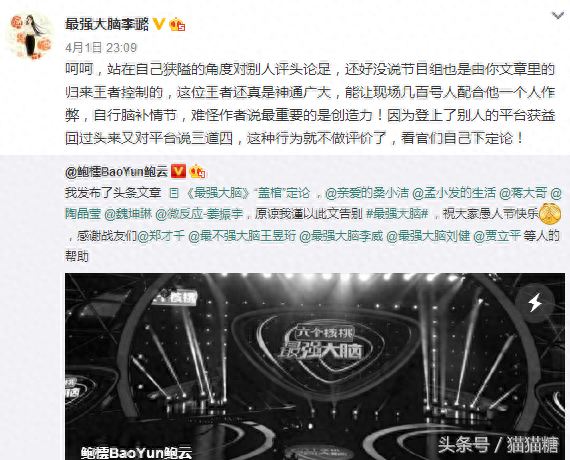 第四季《最强大脑》即将收官,几位老选手也纷纷发微博告别。不过别看节目快要结束了,场外的争议却依然难以消停。比如4月1日中午的时候,鲍橒发了一条长微博,对这一季节目表达了自己的一些看法,而就在4月1日的晚上,这一季名人堂轮值主席王峰的女友李璐转发了鲍橒的微博,并称其“狭隘”。