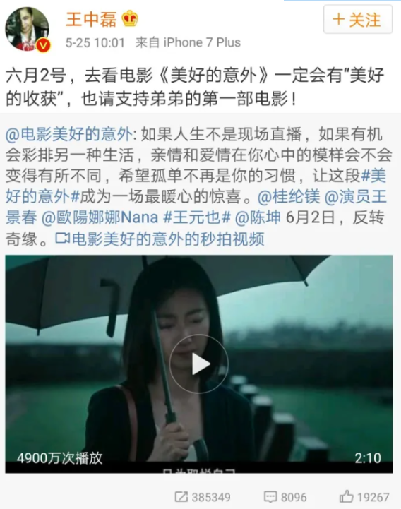 王中磊的儿子王元也第一次拍电影时,更是大半个娱乐圈都来帮他宣传,这种盛况,除了何炅的社交账号,也就属王中磊这里才会有了。