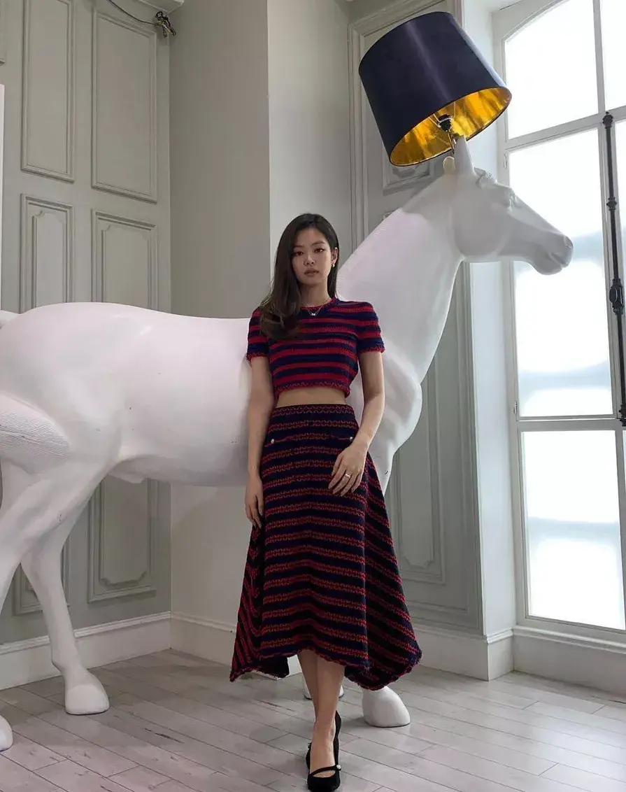 比如160cm出头的Jennie,平时穿衣服就很会凸显自己身材优势——小蛮腰、直角肩,真是太打眼了!