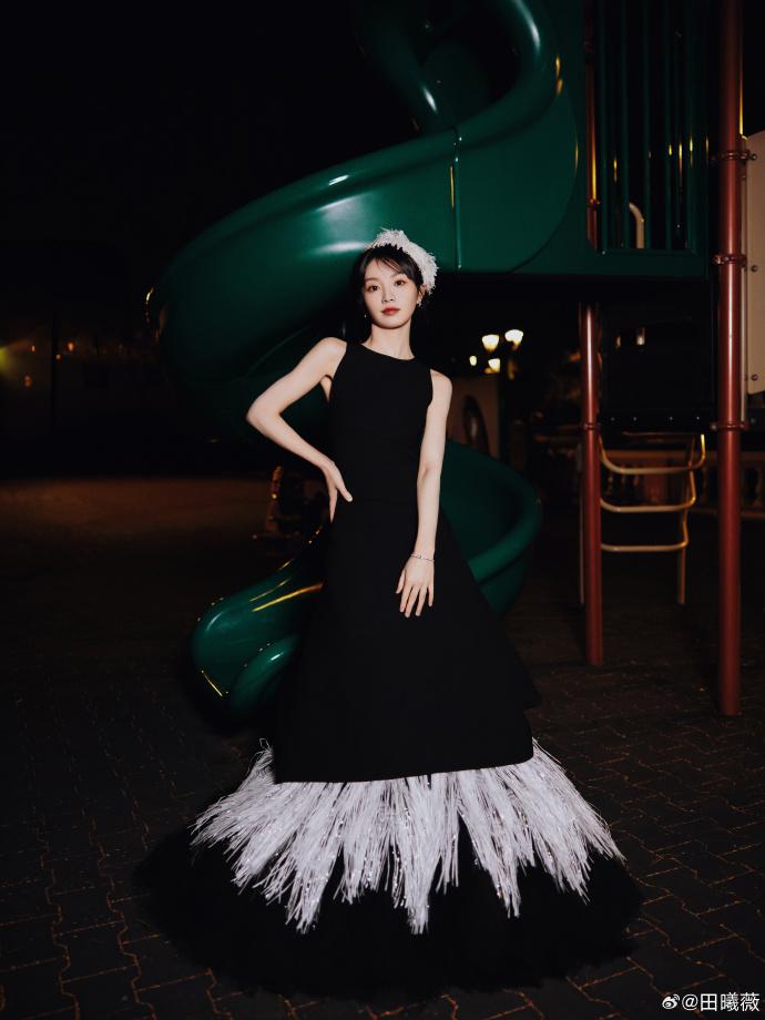 田曦薇穿黑裙配白流苏 夜灯下起舞优雅复古