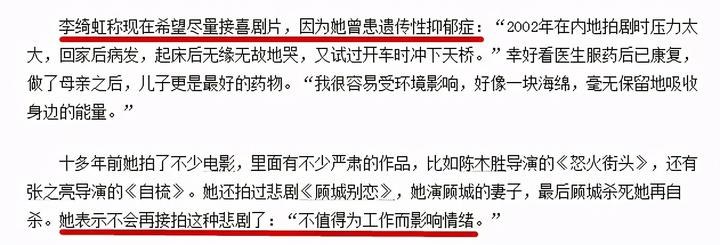 李绮红一度以为自己能摆脱家族遗传病,结果因为拍了几部严肃的电影,饰演了几次悲剧角色,最终还是诱发了遗传性抑郁症。